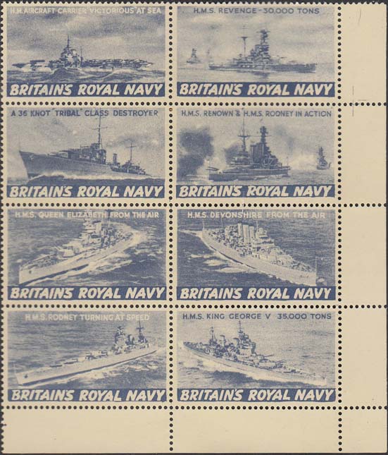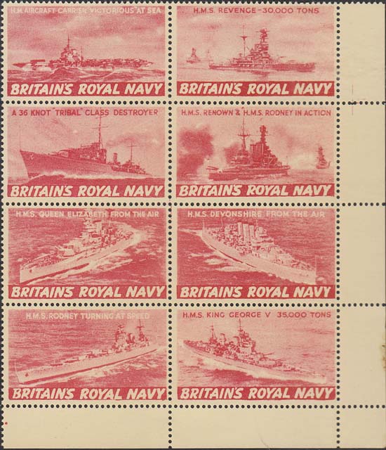 1942(?) г. Разм. рисунка 38,5 х 22 мм. Одноцветная печать на белой бумаге. Зубц. 14 1/2. С клеем. В центре изображения боевых кораблей английского флота времен Второй мировой войны. Сверху подпись к рисунку на английском языке. Внизу на сплошном фоне текст на английском языке: "Британский Королевский флот".