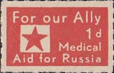1942(?) г. Разм. рис. 25 х 14,5 мм. Одноцветная печать на белой бумаге. Линейная просечка. С клеем. На сплошном фоне в центре слева пятиконечная звезда. справа номинал. Сверху текст на английском языке: "Для наших союзников". Внизу текст в две строки на английском языке: "Медицинская помощь России".