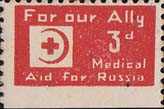 1942(?) г. Разм. рис. 23,5 х 14 мм. Одноцветная печать на белой бумаге. Зубц. 11. С клеем. На сплошном фоне в центре слева красный крест и красный полумесяц. Справа номинал. Сверху текст на английском языке: "Для наших союзников". Внизу текст в две строки на английском языке: "Медицинская помощь России".