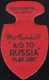 1942 г. Виньетка сложной формы разм. 27 х 45 мм. Двухцветная печать на плотной белой бумаге. В центре текст в четыре строки: "Мр. Черчилль "Помощь России" День флага". Сверху серия и регистрационный номер.