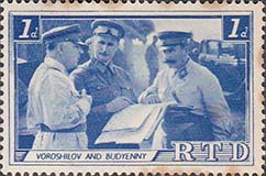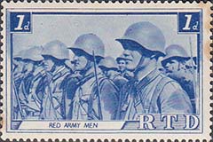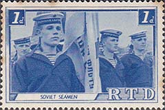 1942(?) г. Разм. по перфорации разм. 35 х 26 мм. Одноцветная печать на белой бумаге. Нерегулярная зубц. С клеем. В центре стрелок за пулеметом и пятиконечная звезда. Сверху текст на английском языке: "Для наших союзников". Внизу текст на английском языке: "Медицинская помощь России".