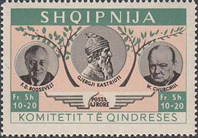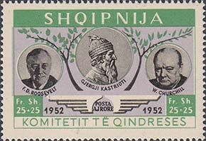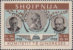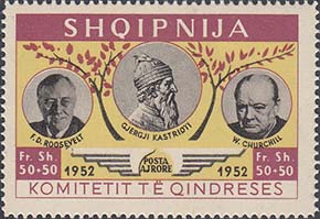1951 г. Первый выпуск. Разм. рамки 44 х 38 мм. Многоцветная печать на белой бумаге. Зубц. 13 3/4. С клеем. В центре портреты Г. Кастриоти, Т. Рузвельта и У. Черчилля. Тексты на албанском языке и номинал.