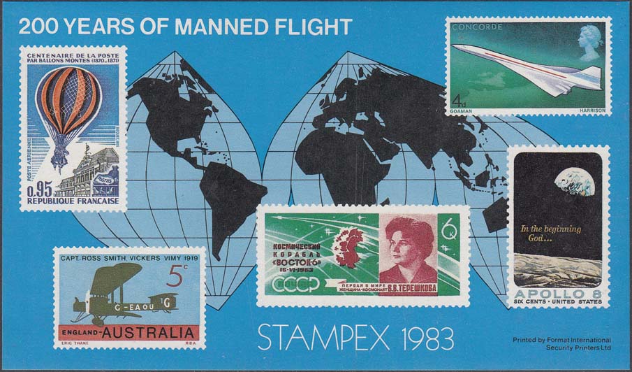 1983 г. Разм. 152 х 90 мм. Многоцветная печать на белой бумаге. С клеем. В центре на сплошном фоне проекция карты Земного шара и изображения почтовых марок различных стран, посвященных авиации и космонавтике. Тексты на английском языке.