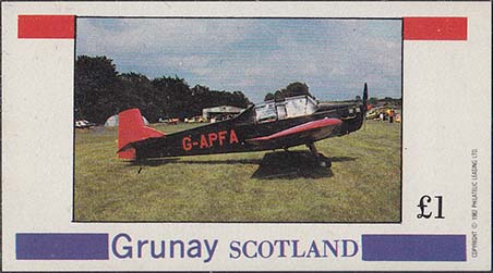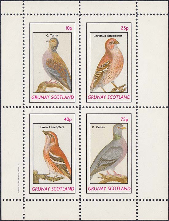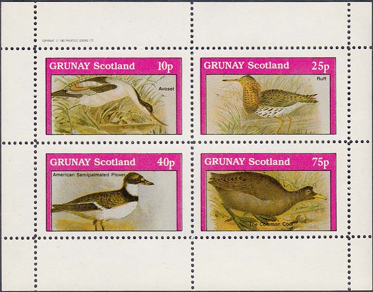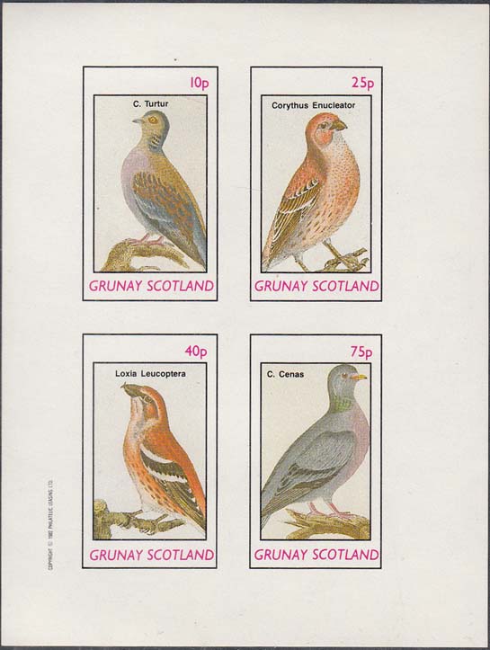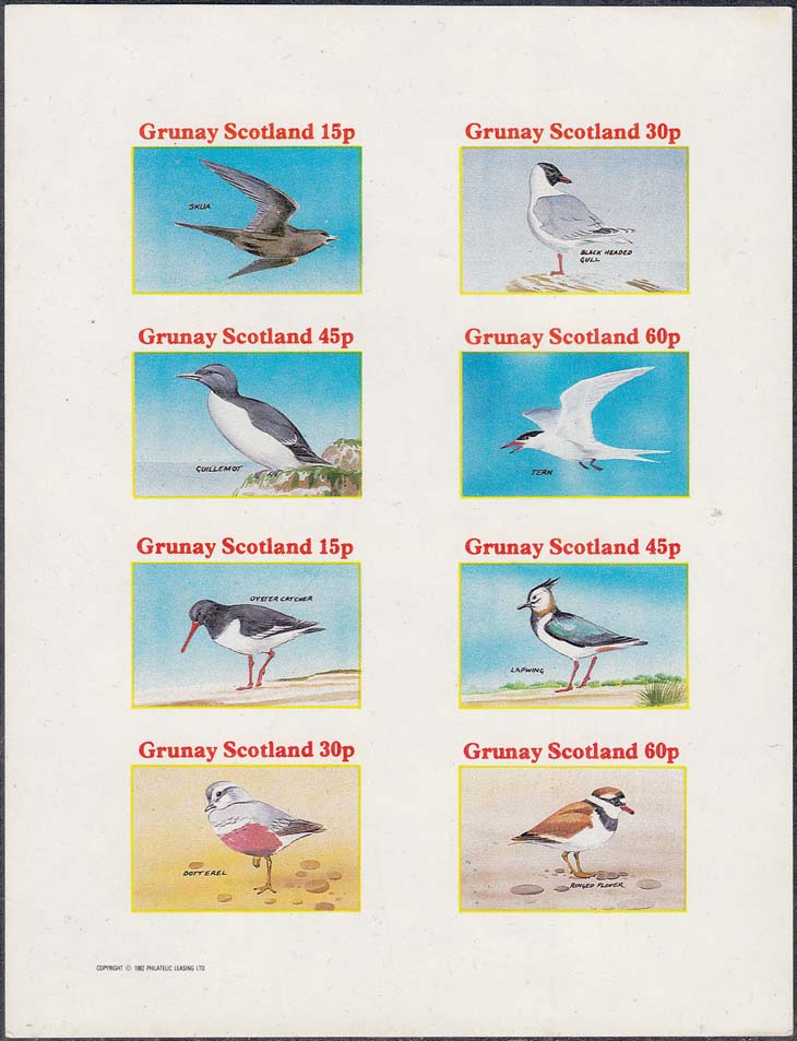 1982 г. Разм. рис. 35 х 22 мм. Многоцветная печать на белой глянцевой бумаге. С клеем. В прямоугольной рамке в центре птицы различных видов и пояснительный текст на английском языке. Сверху текст на английском языке: "Grunay scotland" и номинал.
