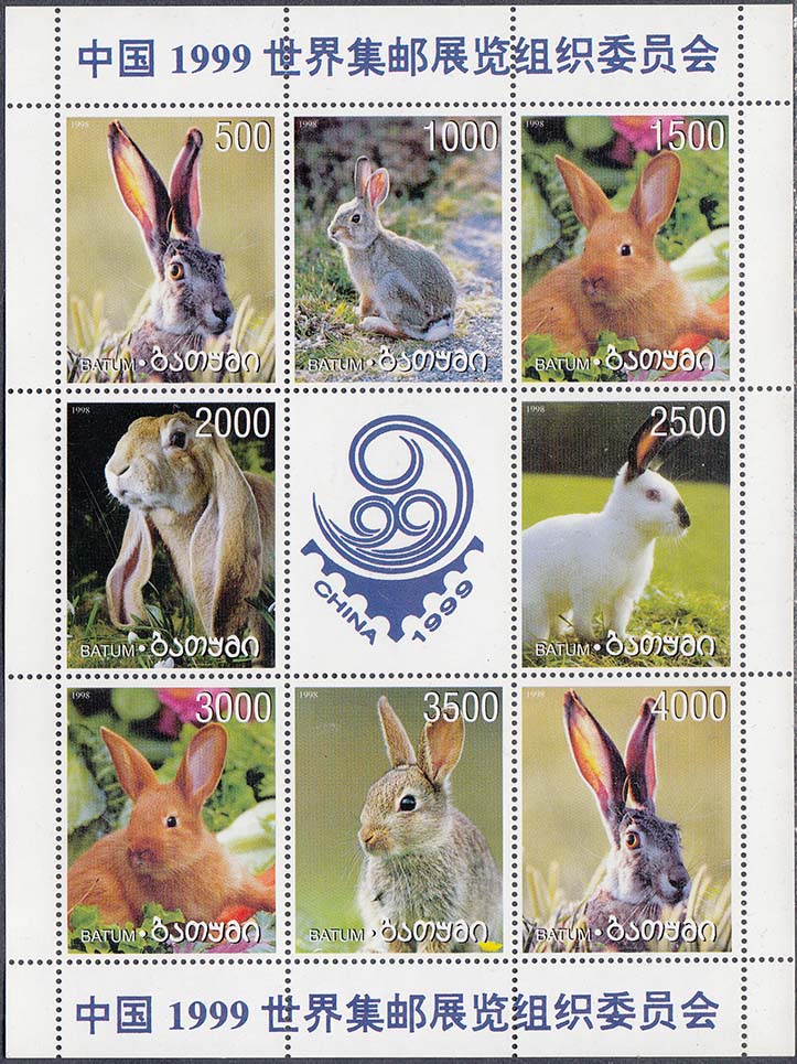 1999 г. Разм. рис. 32 х 41 мм. Многоцветная печать на белой глянцевой бумаге. Зубц. 13 3/4. В центре кролики различных пород. В правом верхнем углу номинал. Внизу текст: "Батум" на русском и грузинском языках.