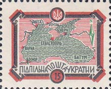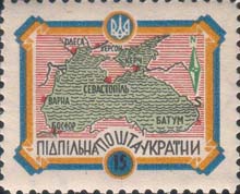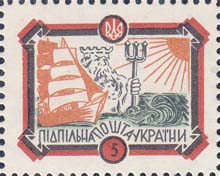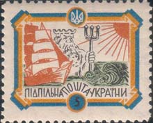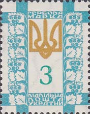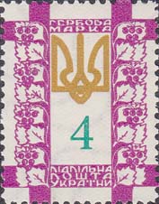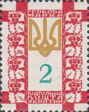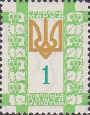 1960 г. Разм. по перфорации 19 х 39 мм. Трехцветная печать на белой бумаге. Зубц. 10 и Б.З. С клеем. В центре в декоративной рамке герб Украины - трезубец. Сверху текст в две строки: "Гербовая марка". Внизу текст в три строки: "Подпольная почта Украины".