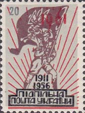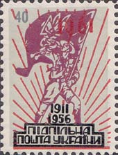 1956 г. 45-летие Пласта. Разм. по перфорации 28 х 37 мм. Многоцветная печать на белой бумаге с ВЗ "Волнистые линии". Зубц. Зубц. 10 и Б.З. С клеем. В центре на сплошном фоне скаут с горном и флагом. В левом верхнем углу номинал. Внизу текст в четыре строки: "1911 1956 Подпольная почта Украины".