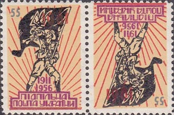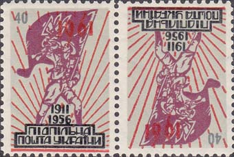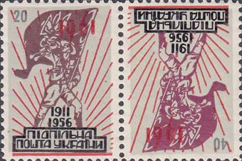 1961 г. 50-летие Пласта. Красная надпечатка даты: "1961" на знаках выпуска 1956 г., посвященных 45-летию Пласта.