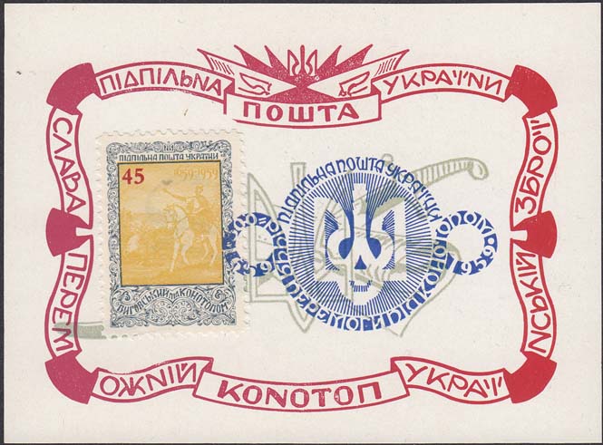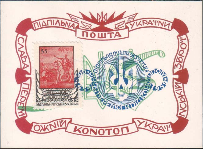 1959 г. К 300-летию битвы под Конотопом. Листок разм. 111 х 80 мм. Многоцветная печать на белой мелованной бумаге. В декоративной рамке в центре символика Украины. Слева наклеена марка УПП, посвященная 300 летию Конотопской битвы. На лентах рамки текст на украинском языке: «Подпольная почта Украины. Конотоп. Слава победному украинскому оружию».