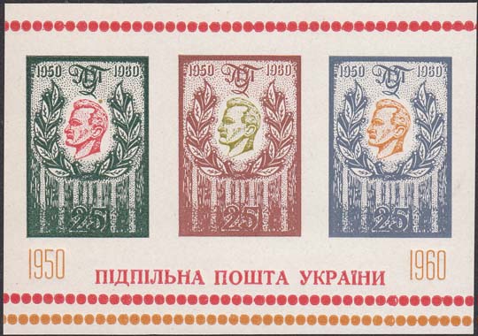 1960 г. К 10-летию сметри Р. Шухевича. Листок разм. 91 х 64 мм. Многоцветная печать на белой мелованной бумаге. В центре три мар-ки УПП с профилем Р. Шухевича. Внизу текст на украинском языке: «1950 Подпольная почта Украины. 1960».