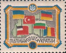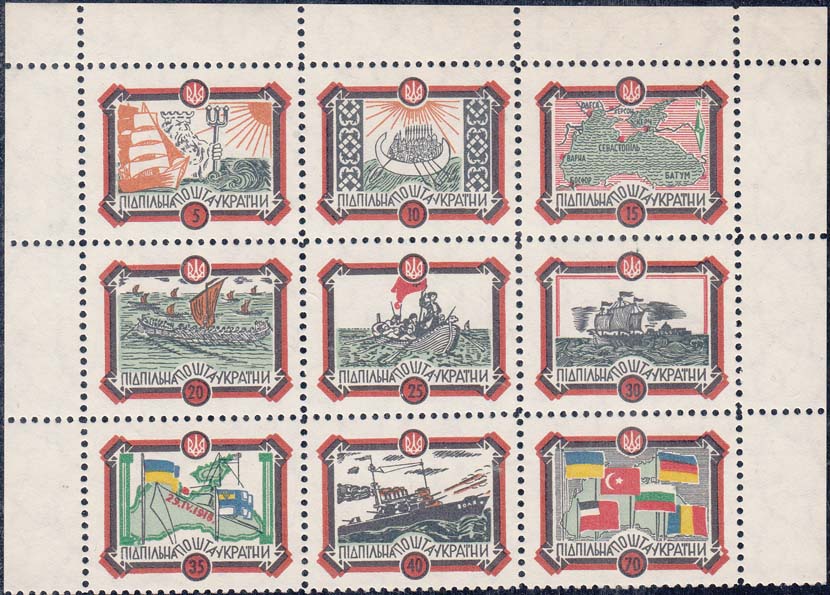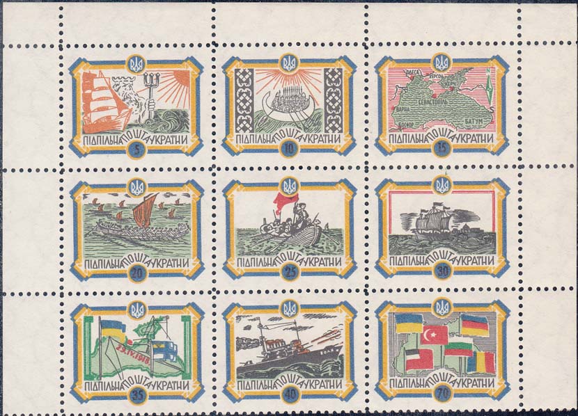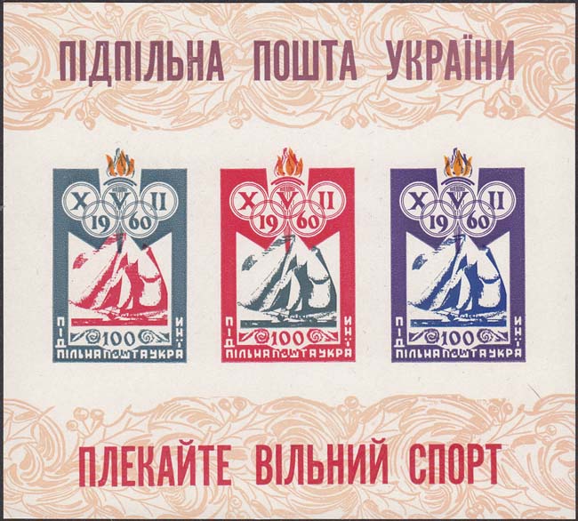 1960 г. Листок разм. 108 х 98 мм. Многоцветная печать на белой мелованной бумаге. В центре три марки УПП с парусником. Внизу текст на украинском языке: «Подпольная почта Украины». Внизу текст на украинском языке: «Поддерживайте свободный спорт».
