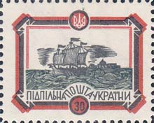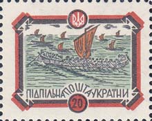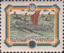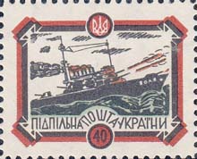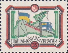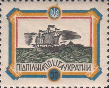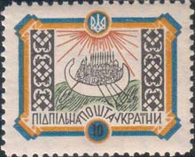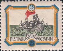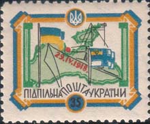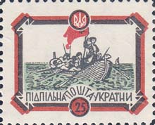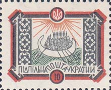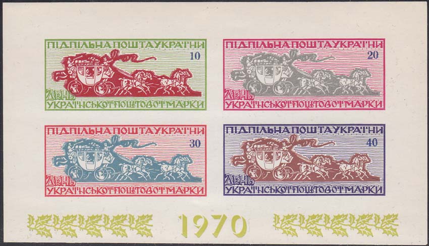 1970 г. Разм. рамки 54 х 24 мм. Многоцветная печать на белой мелованной бумаге. Зубц. 12 и БЗ. С клеем. В прямоугольной рамке почтовая карета в движении. Сверху текст на украинском языке: "Подпольная почта Украины" и номинал. Внизу текст на украинском языке: "День украинской почтовой марки".