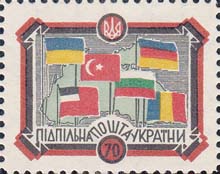 1953 г. Черная типографская надпечатка текста на украинском языке в три строки: "700 лет коронации короля Данила 1253 - 1953" на марках выпуска Украинского Национального Совета, посвященных 30-летию ноябрьского переворота во Львове.