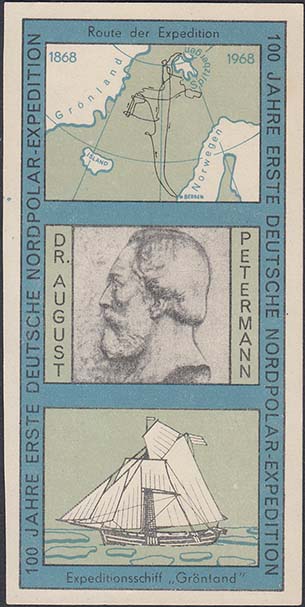 1986 г. Разм. рамки 45 х 96 мм. Многоцветная печать на белой бумаге. В прямоугольной рамке в центре портрет А. Петерманна в профиль. Сверху карта экспедиции. Внизу корабль экспедиции. Пол периметру текст на немецком языке: "100 лет первой немецкой экспедиции на Северный Полюс. Маршрут экспедиции. Корабль экспедиции".