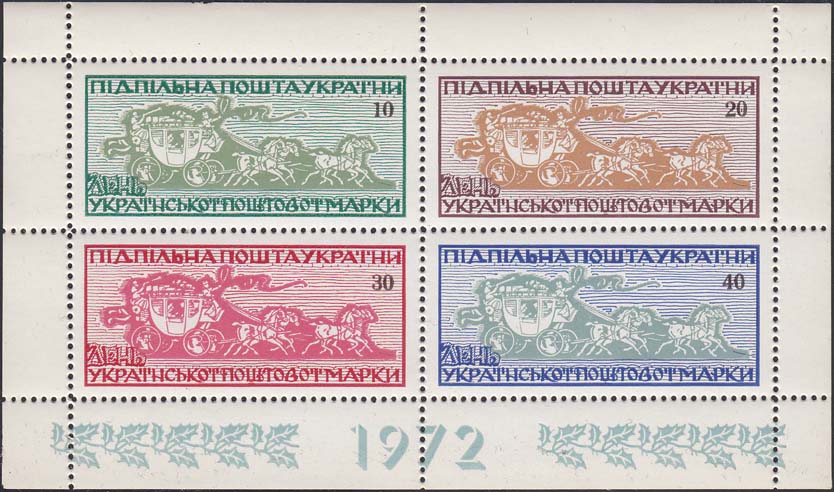 1972 г. Разм. рамки 54 х 24 мм. Многоцветная печать на белой мелованной бумаге. Зубц. 12 и БЗ. С клеем. В прямоугольной рамке почтовая карета в движении. Сверху текст на украинском языке: "Подпольная почта Украины" и номинал. Внизу текст на украинском языке: "День украинской почтовой марки".