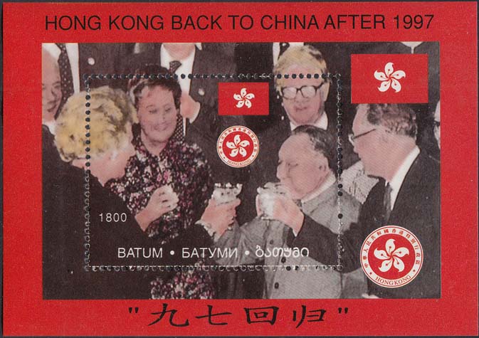 1997 г. Блок разм. 114 х 80 мм. Многоцветная печать на белой глянцевой бумаге. Зубц. 11 1/4. С клеем. В центре группа политиков Отмечающих передачу Гон-Конга Китаю. В правом нижнем углу номинал. Внизу название территории на английском русском и грузинском языках. На полях блока продолжение рисунка и тексты на английском и китайском языках.