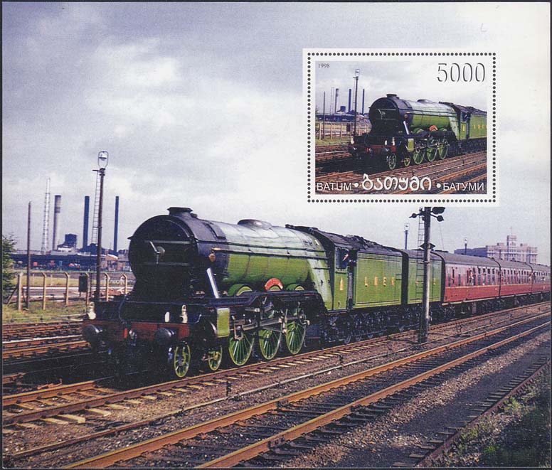 1998 г. Блок разм. 131 х 111 мм. Разм. рис. марки 41 х 32 мм. Многоцветная печать на белой глянцевой бумаге. Имитация зубцовки. В центре паровоз с вагонами. Сверху дата: "1998" и номинал. Внизу название территории на английском, грузинском и русском языках: "Батуми". На полях блока увеличенный рисунок, аналогичный рисунку марки.