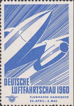 1960 г. Разм. по перфорации. 41 х 57 мм. Одноцветная печать на белой глянцевой бумаге. Зубц. 10 1/2. С клеем.В центре стилизованное изображение реактивного самолета. Внизу текст на немецком языке в четыре строки: "Немецкое авиашоу 1960 аэропорт Ганновера 24 апреля - 3. мая".