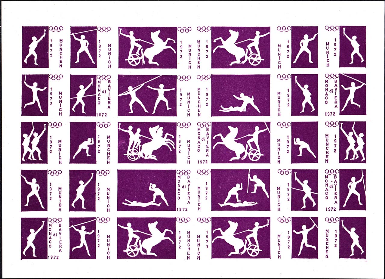 1972 г. Разм. по перфорации 28 х 28 мм и и 46 х 27 мм. Одноцветная печать на белой бумаге. Зубц. лин. 10 и Б.З. В центре на сплошном фоне изображение античных видов спорта. Справа Тексты на различных языках: "Мюнхен 1972" и олимпийская символика.