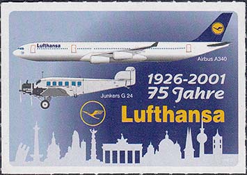 2001 г. Разм. рис. 57 х 38 мм. Многоцветная печать на белой глянцевой бумаге. Линейная просечка. С клеем. В центре на сплошном фоне самолеты Юнкерс Г24 и Аэробус А340. Логотип компании и текст на немецком языке в три строки: "1926 - 2001 75 лет Люфтганза". Внизу силуэты различных сооружений столиц мира.