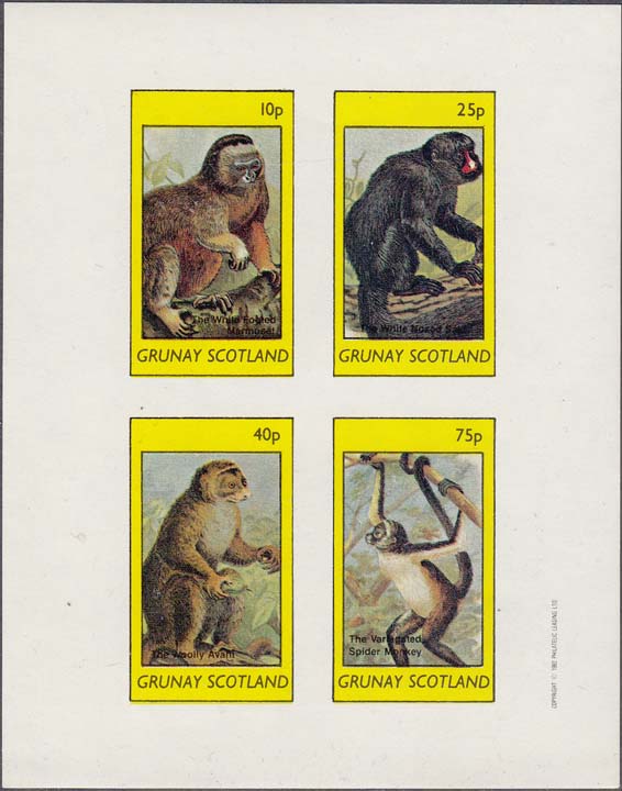 1982 г. Разм. рис. 25 х 44 мм. Многоцветная печать на белой глянцевой бумаге. с клеем. В центре изображение обезьян различных видов и пояснительный текст на английском языке. Внизу текст на английском языке: "Gruney Scotland". Сверху номинал.