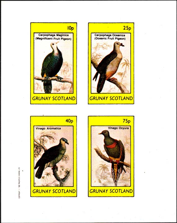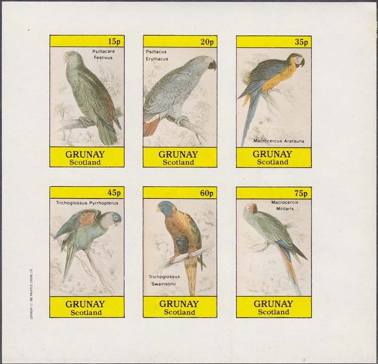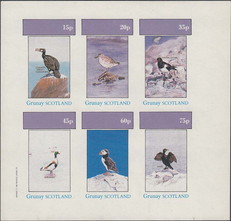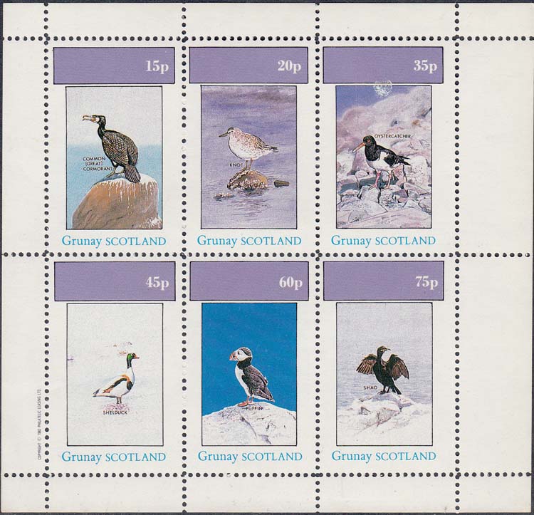 1982 г. Разм. рамки 23 х 34 мм. Многоцветная печать на белой глянцевой бумаге. Зубц. лин. 10 3/4 и Б.З. С клеем. В центре в прямоугольной рамке птицы различных видов и пояснительный текст на английском языке. В правом верхнем углу номинал. Внизу текст на английском языке: "Grunay Scotland".