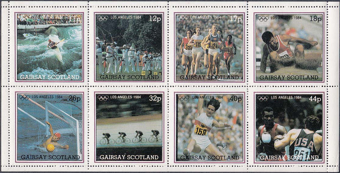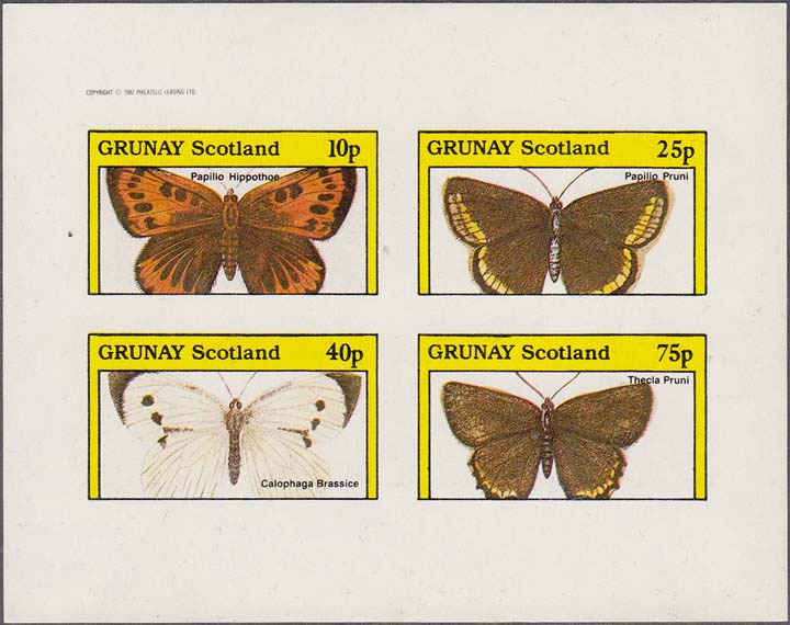 1982 г. Разм. рис. 45 х 25 мм. Многоцветная печать на белой глянцевой бумаге. Зубц. 10 3/4 и Б.З. С клеем. В центре изображение бабочек различных видов и пояснительный текст на английском языке. Сверху текст на английском языке: "Gruney Scotland" и номинал.