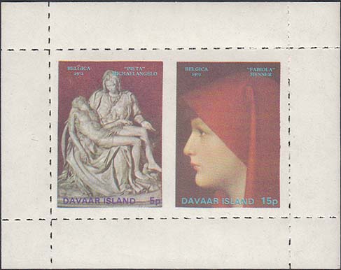 1980(?) г. Блок. Разм. 136 х 73 мм. Многоцветная печать на белой бумаге. В центре различные картины. Горизонтальная просечка. С клеем.