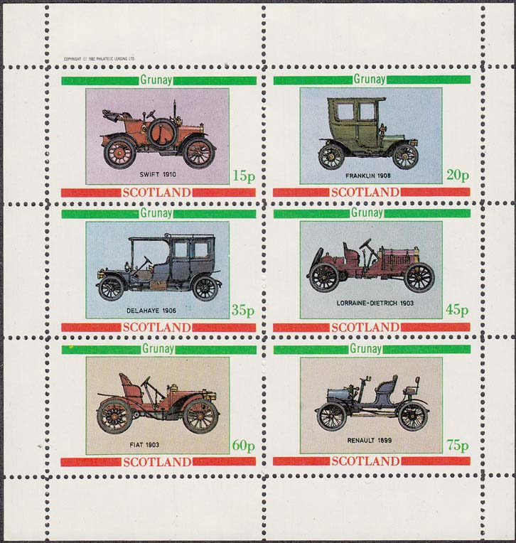 1982 г. Разм. рис. 46 х 29 мм. Многоцветная печать на белой глянцевой бумаге. Зубц. Лин. 10 3/4. С клеем. В центре на сплошном фоне автомобили различных марок и пояснительный текст на английском языке. В правом ниднем углу номинал. сверху и снизу текст на английском языке: "Grunay Scotland".