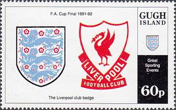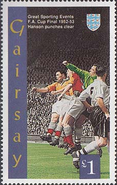1980(?) г. Разм. рис. 33 х 57 мм. Многоцветная печать на белой бумаге. Зубц. 14 1/2. С клеем. В центре различные футбольные сюжеты, символика клубов и тексты на английском языке.