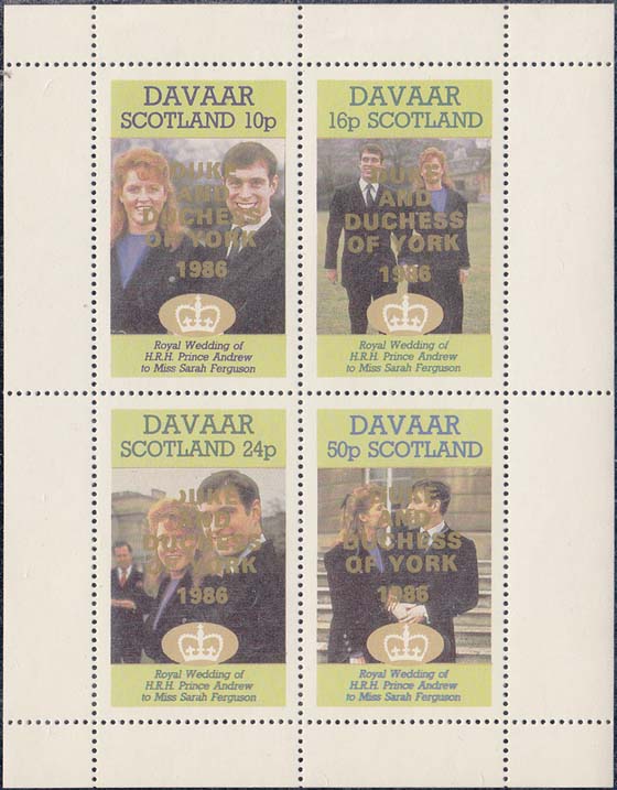 1986 г. Надпечатка различных цветов текста в пять строк: "Герцог и Герцогина Йоркские" на знаках посвященных свадьбе Принца Эндрю и С. Фергюсон.