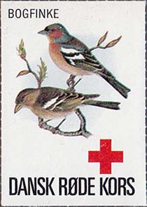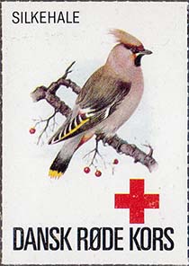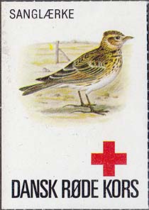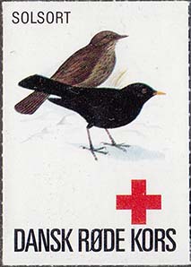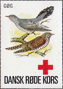 1980(?) г. Разм. 35 х 50 мм. Многоцветная печать на белой бумаге. Линейная просечка. С клеем. В центре птицы различных видов. Внизу знак красного креста и текст на датском языке: "Датский Красный Крест"
