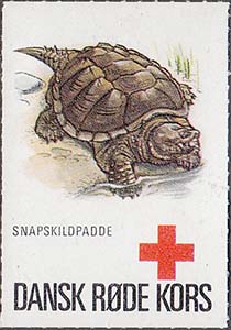 1980(?) г. Разм. 36 х 51 мм. Многоцветная печать на белой глянцевой бумаге. Линейная просечка. В центре различные рептилии. Внизу знак Красного Креста и текст на датском языке: "Датский Красный Крест".