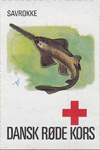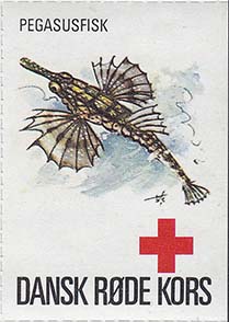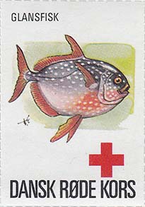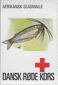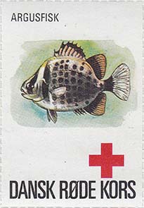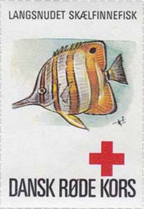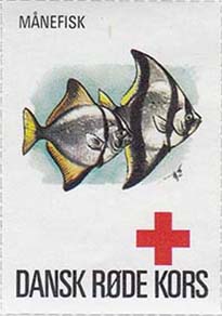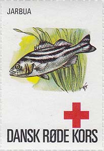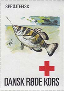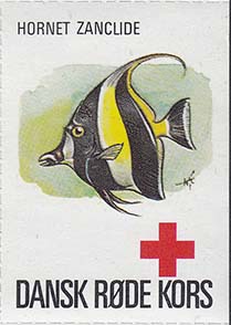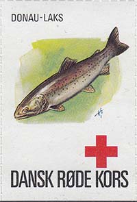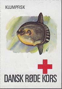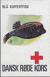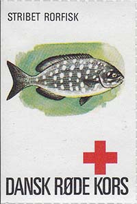 1980(?) г. Разм. 35 х 50 мм. Многоцветная печать на белой бумаге. Линейная просечка. С клеем. В центре рыбы различных видов. Внизу знак красного креста и текст на датском языке: "Датский Красный Крест".