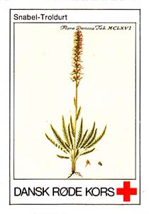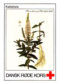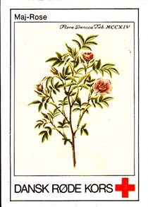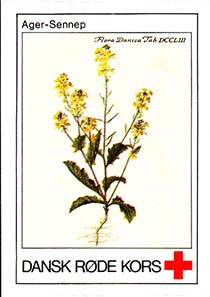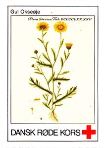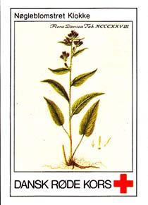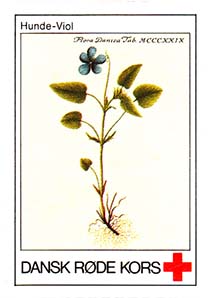 1980(?) г. Разм. 31 х 46 мм. Многоцветная печать на белой бумаге. Линейная просечка. С клеем. В центре растения различных видов. Внизу знак красного креста и текст на датском языке: "Датский Красный Крест".