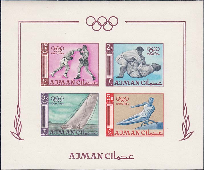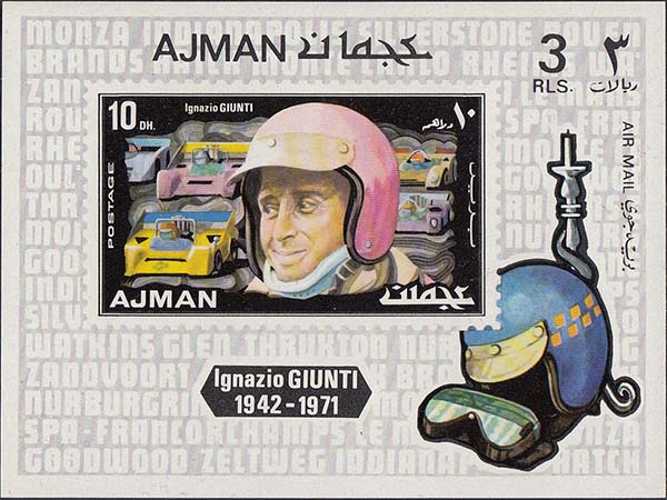 1971 г. Блок разм. 101 х 76 мм. Многоцветная печать на белой бумаге. Зубц. греб. 11. и Б.З. С клеем. В центре повторение рисунков марок основного выпуска. На полях название страны и номинал на английском и арабском языках, табличка с годами жизни, гоночный шлем и очки.