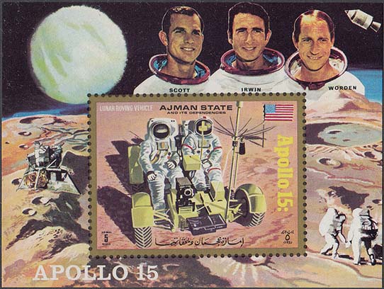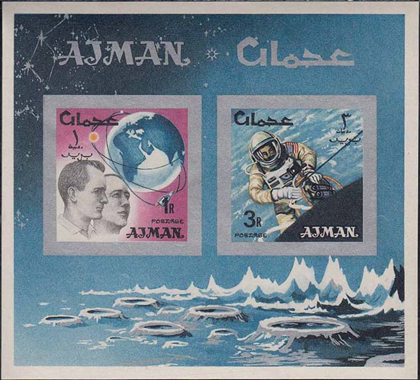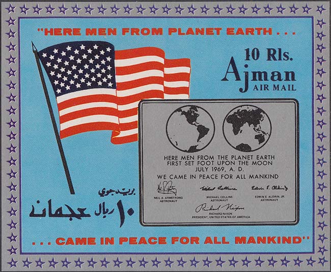 1969 г. 10.09.1969 г. Блок разм. 108 х 90 мм. Многоцветная печать на белой бумаге. В центре флаг США и мемориальная доска. Название страны и номинал на английском и арабском языке.