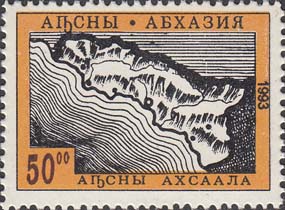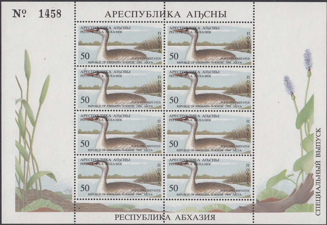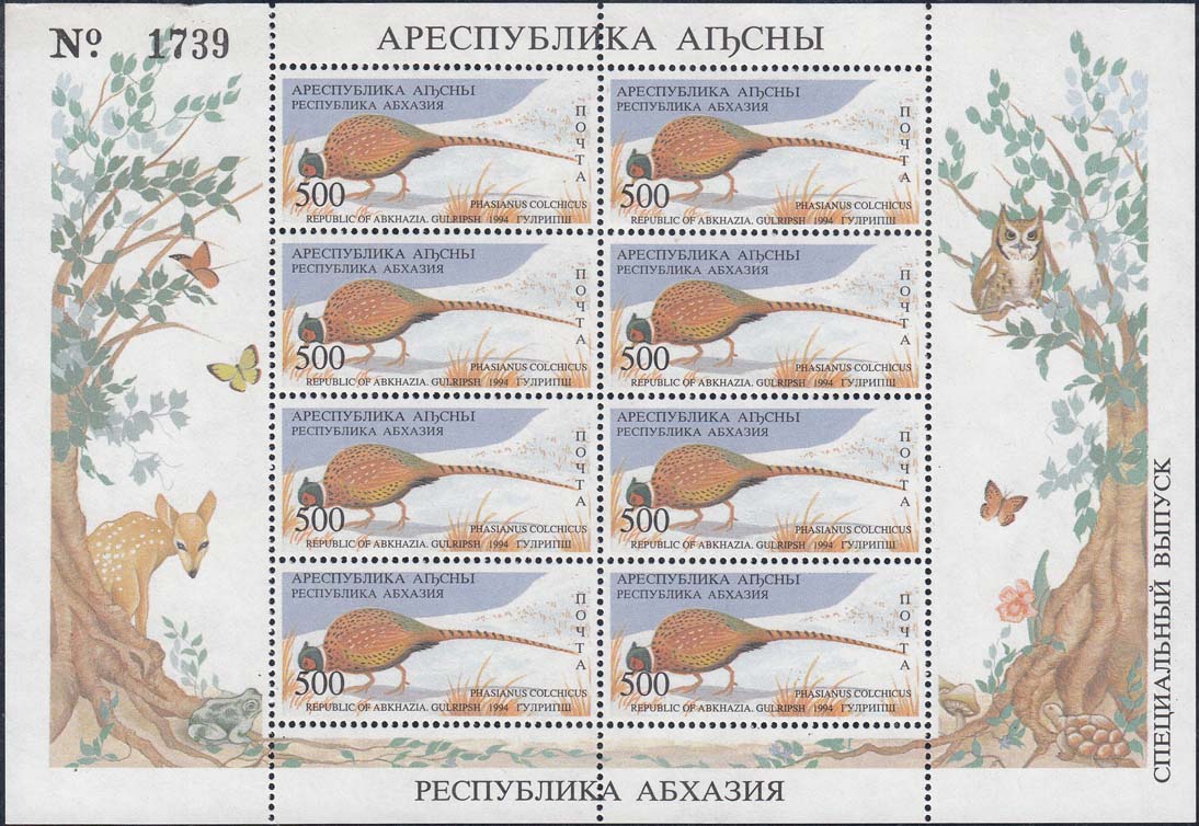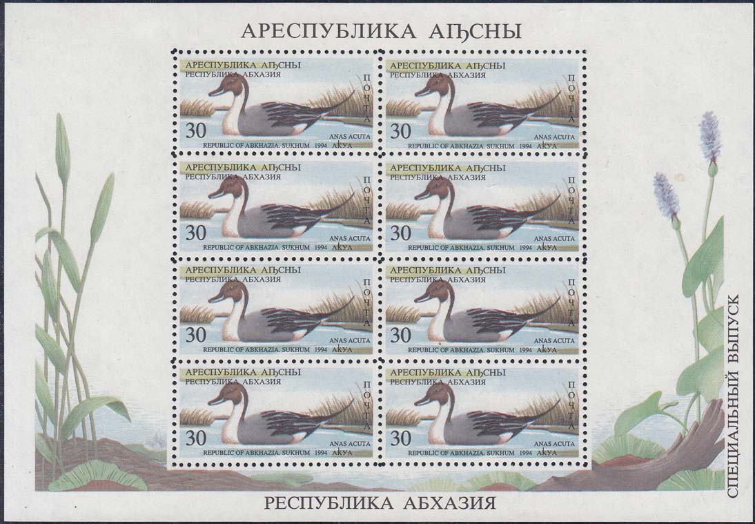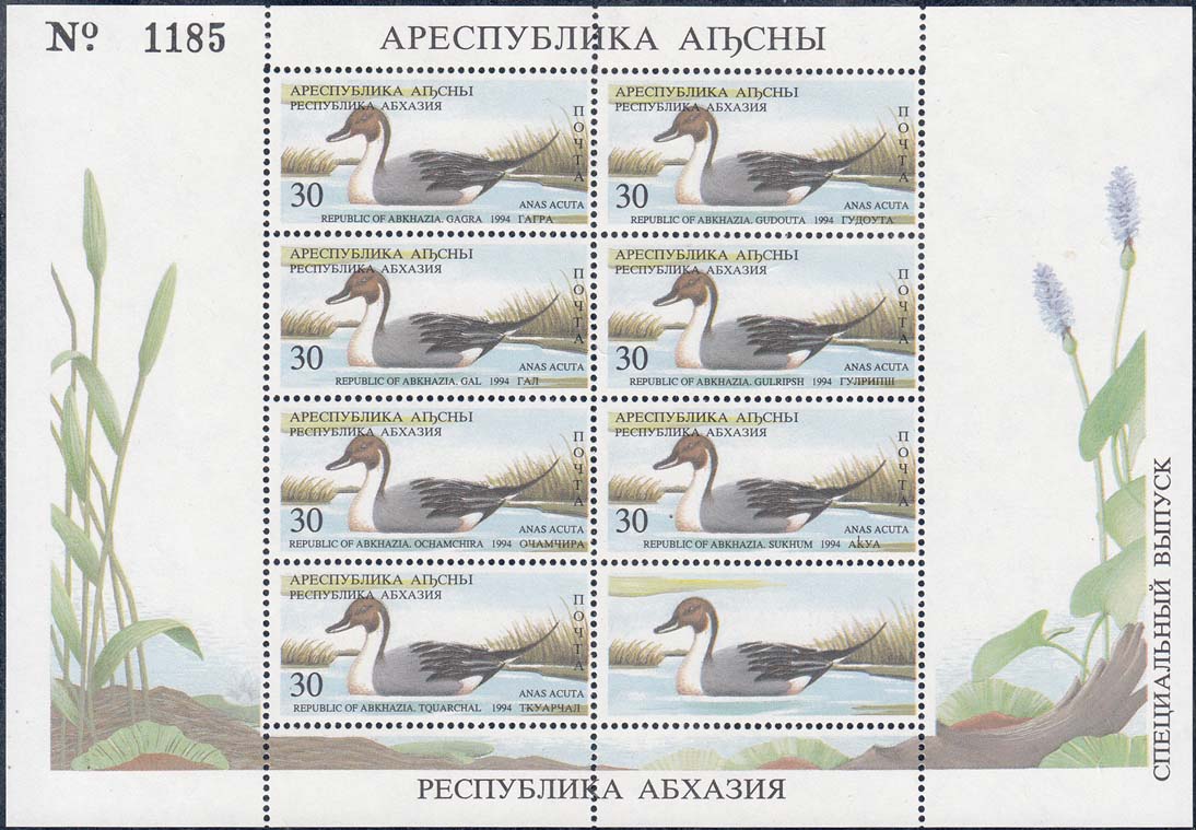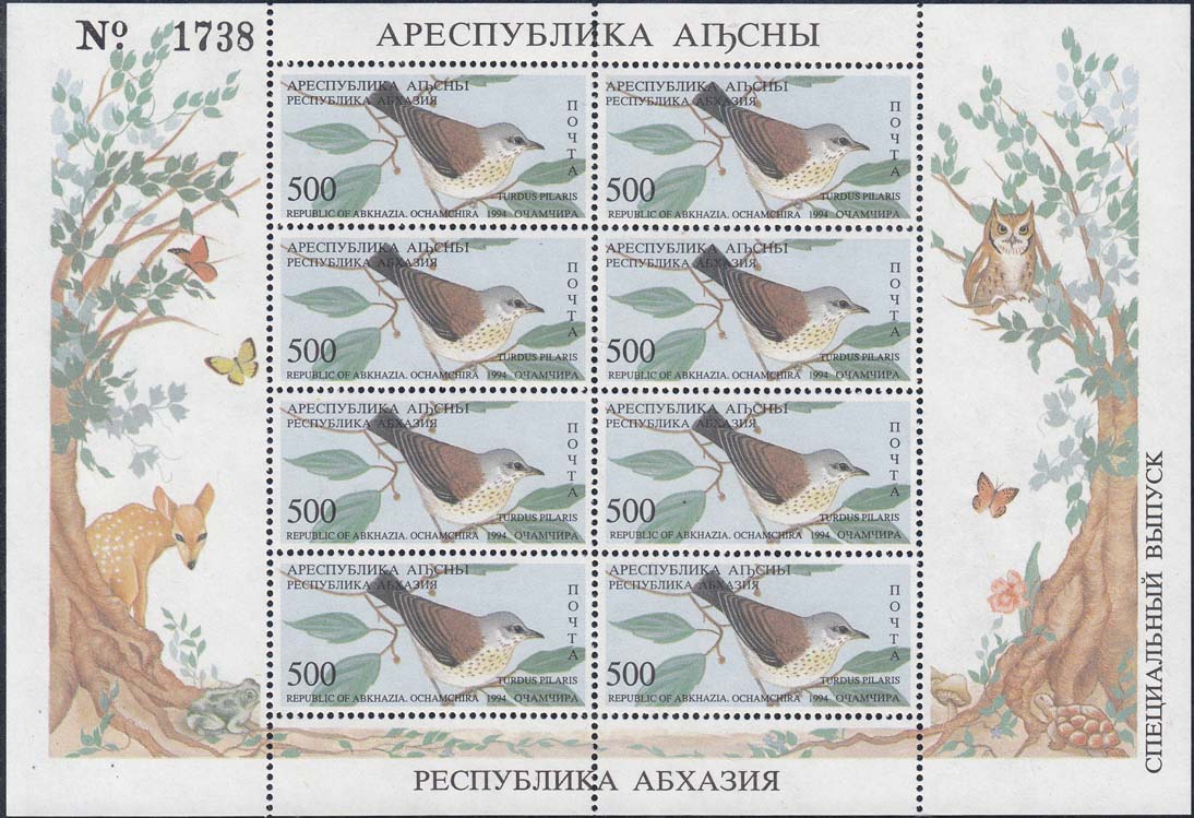 1994 г. 31.05. - октябрь. Разм. рис. 48 х 22 мм. Многоцветная печать на белой бумаге. Зубц. Лин. 10. С клеем. В центре птицы различных видов. По периметру номинал и тексты на абхазском языке.
