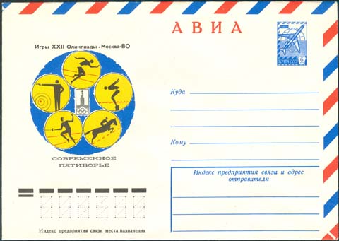 1977 г. Эмблема олимпиады и символы видов спорта пятиборья. Текст: "Игры XXII Олимпиады. Москва-80. Современное пятиборье".