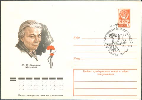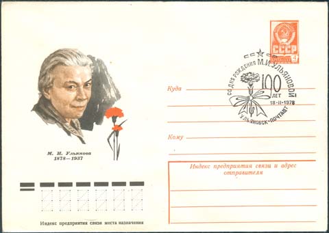СГ1. Черный спецштемпель с текстом: "100 лет со дня рождения М.И. Ульяновой. 18-II-1978 Москва Почтамт".