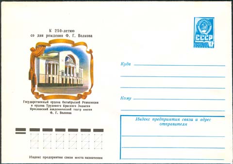 1978 г. Здание театра. Текст в семь строк: "К 250-летию со дня рождения Ф.Г. Волкова. Государственный ордена Октябрьской Революции и ордена Трудового Красного Знамени Ярославский театр имени Ф.Г. Волкова".