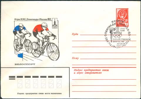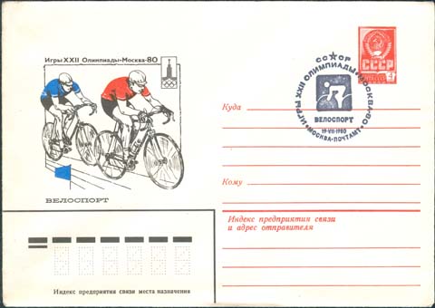 1. СГ1. Черно-фиолетовый спецштемпель с текстом: "Игры XXII Олимпиады. Москва-80. Велоспорт. 19.VII.1990 Москва. Почтамт".