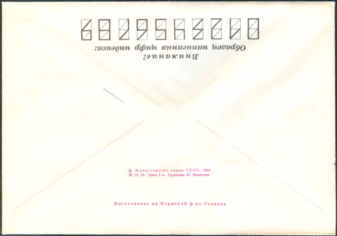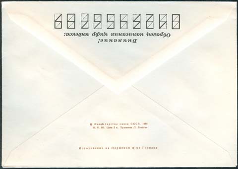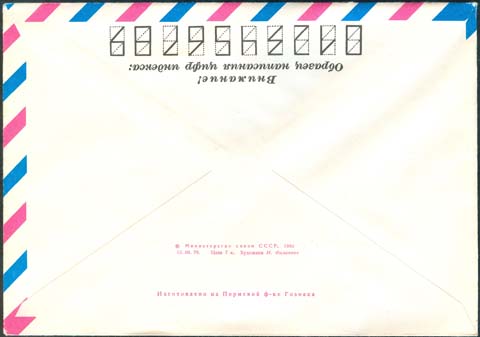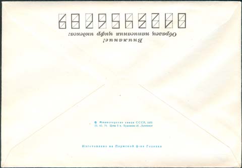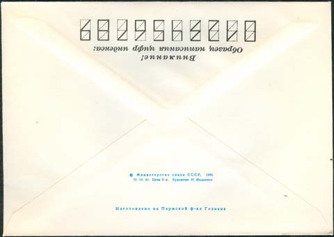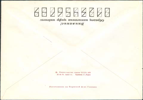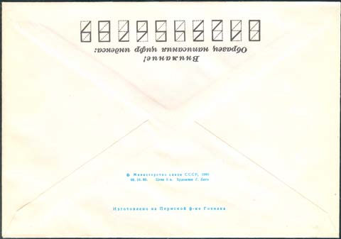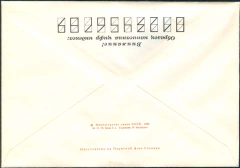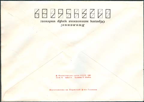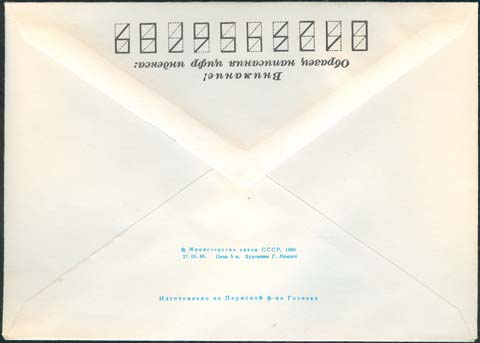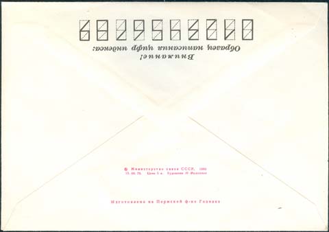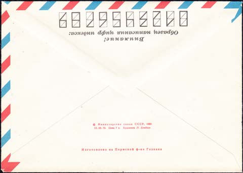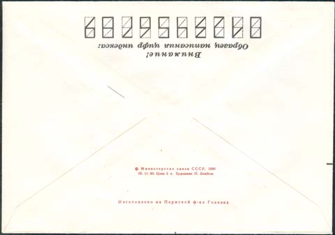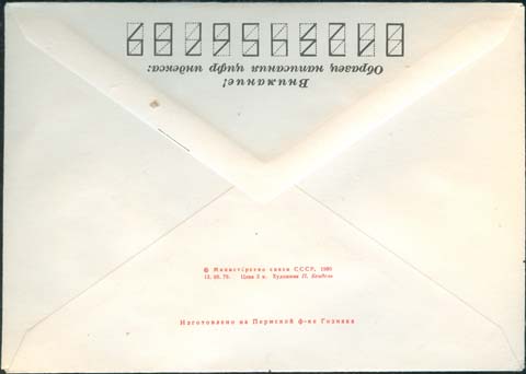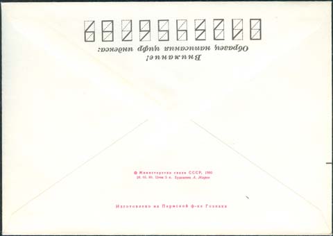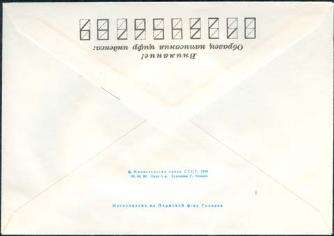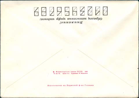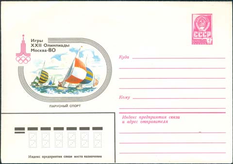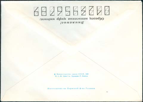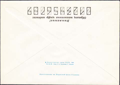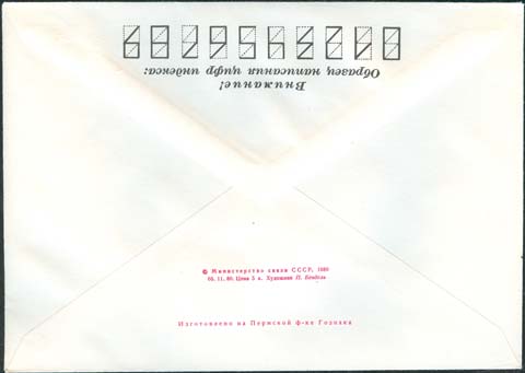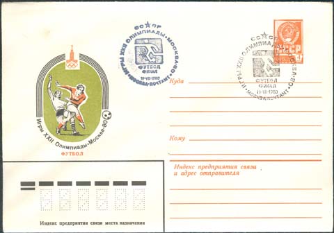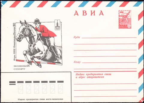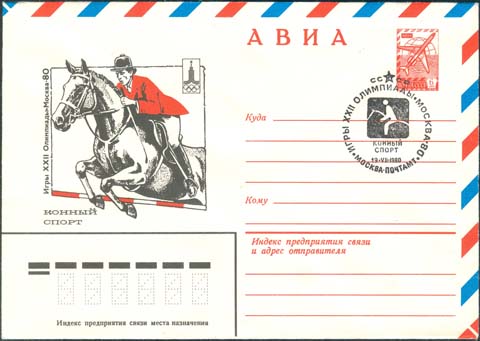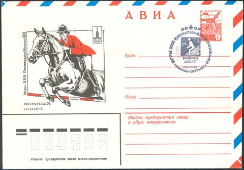 Примечание: СГ1. Спецштемпель с текстом:"Мгры XXII олимпиады Москва-80. Конный спорт. Москва почтамn 19.VII.1980". Цвета: Черный и темно-фиолетовый.
