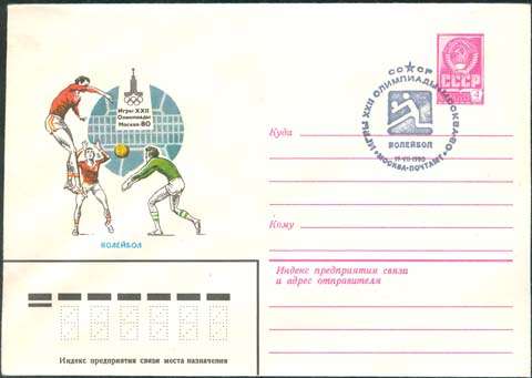 1979 г. Эпизод игры в волейбол. Текст: "Игры XXII Олимпиады. Москва-80".