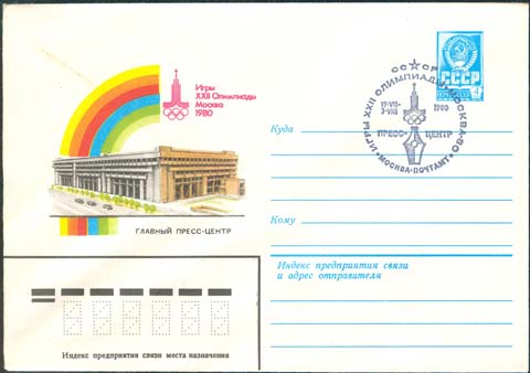 СГ1. Темно-синий спецштемпель с текстом: "Игры XXII Олимпиады Москва-80 Пресс-центр 19.VII -3.VII 1980 Москва Почтамт".