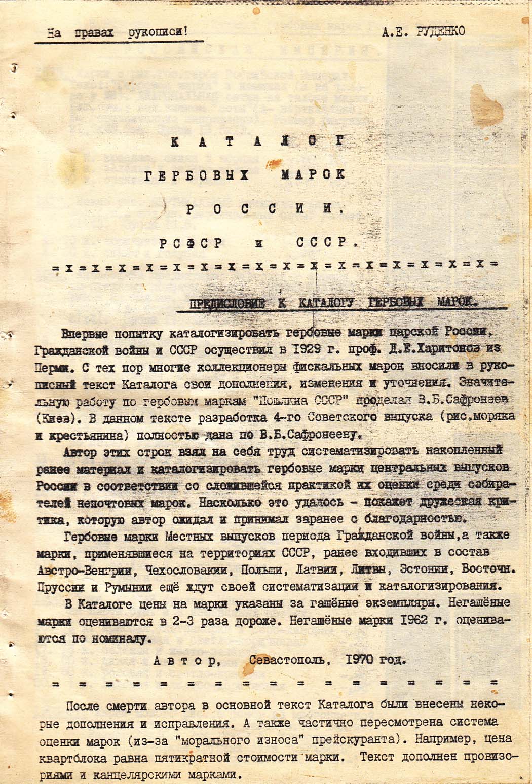 А.Е.Руденко. Каталог гербовых марок России, РСФСР и СССР. Севастополь, 1970 г. (С дополнениями А.Н.Лукьявнова).